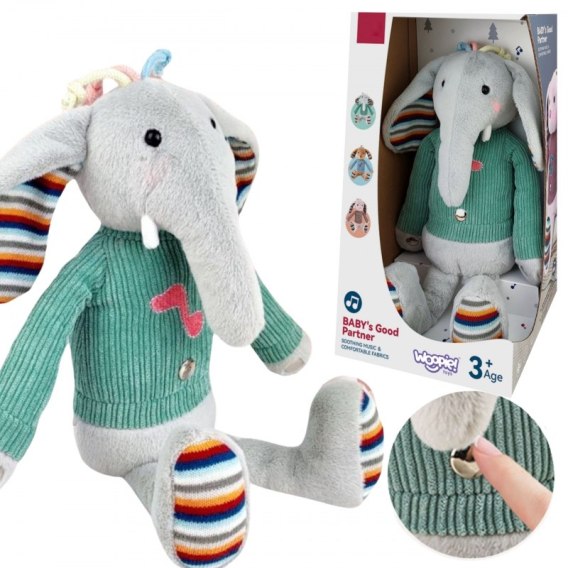 Interaktywny Słonik Przytulanka od marki WOOPIE uspokoi oraz uśpi Twoje dziecko. Jest zarówno uroczym towarzyszem, miękkim i przytulnym, jak i doskonałym towarzyszem do gier i zabaw.