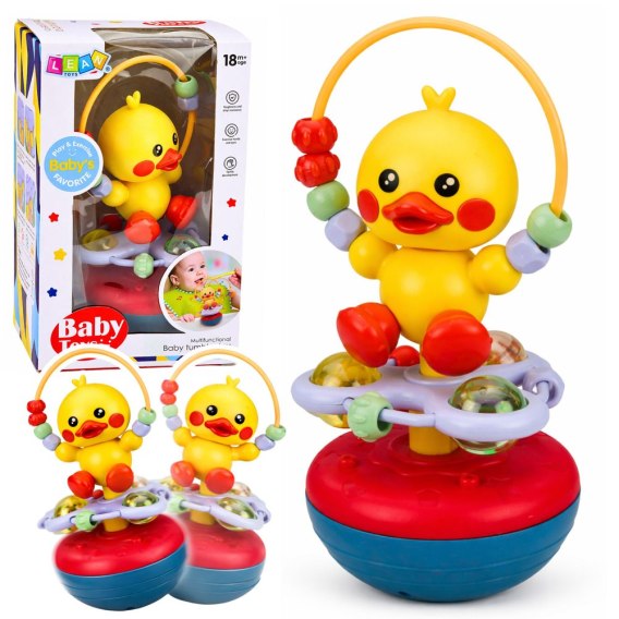 Zabawka posiada klasyczną funkcję wańki wstańki, dzięki której po każdym przechyleniu wraca do pozycji pionowej. To proste, ale niezwykle fascynujące działanie przyciąga uwagę dziecka i uczy zależności przyczynowo skutkowych. Dodatkowo obracająca się głowa kaczuszki oraz kolorowe elementy manipulacyjne sprawiają, że zabawa staje się jeszcze bardziej atrakcyjna.