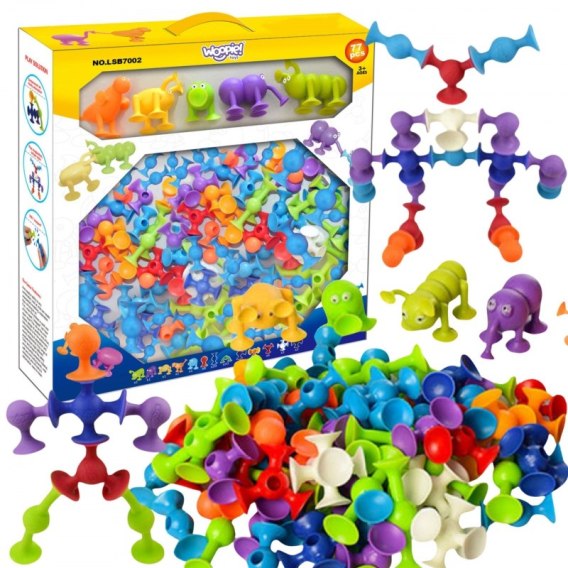 Zestaw klocków konstrukcyjnych od marki WOOPIE to świetny prezent dla twojego malucha! Klocki wykonane zostały z silikonu, są mięciutkie i bezpieczne podczas zabawy. Klocki są edukacyjną zabawką. Pomagają w poznawaniu nowych kształtów, kolorów oraz rozwijają zdolności manualne. Klocki zaprojektowane są tak, aby pobudzić rozwijające się zmysły dziecka: wzrok poprzez wyraziste kolory oraz dotyk poprzez oryginalny kształt i sposób łączenia. Wszystkie elementy również dodawane w zestawie figurki stworki są łączenie na mocne przyssawki. Przyssawki przyklejają się do siebie i do każdej gładkiej powierzchni. To nowy gatunek klocków. Wyginają się, przyklejają się, dyndają, wsysają w inny wymiar kreatywności. To elastyczni pracownicy zawsze gotowi do zabawy i eksperymentowania, przyklejania do wanny, okna a może ściany, komputera, a może.. telefonu... i jak grzeczni goście nie pozostawiają śladów swojej obecności.