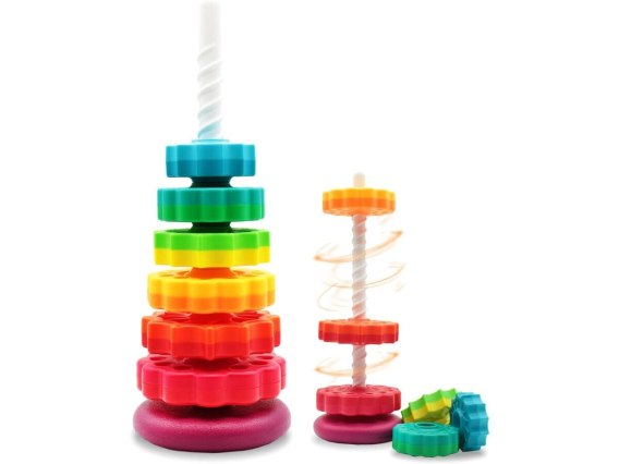 Dziecko może układać klocki w dowolnej kolejności lub według schematu: od największego do najmniejszego i odwrotnie. Układanie takiej tęczowej, zakręconej wieży będzie super zabawą.
