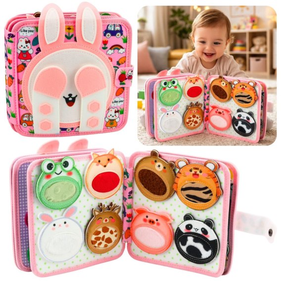 Książeczka sensoryczna filcowa z motywem króliczka to kreatywna zabawka edukacyjna dla najmłodszych dzieci, która wspiera rozwój zmysłów, zdolności manualnych oraz wyobraźni.