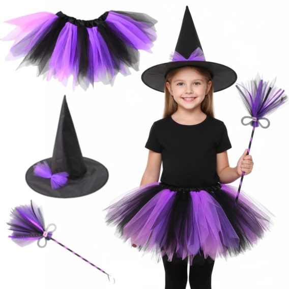 Zestaw czarownicy dla dzieci to doskonały wybór na bale przebierańców, imprezy tematyczne, przedstawienia teatralne czy Halloween. Kolorowa spódniczka z tiulu, klasyczny kapelusz czarownicy oraz lekka miotła.