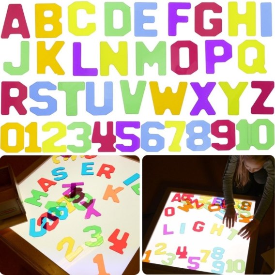 - Zestaw zawiera 38 przezroczystych, kolorowych liter i cyfr