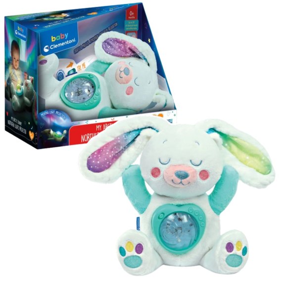 Arktyczny Króliczek to mięciutka przytulanka z funkcją projektora, która wyświetla na ścianie i suficie efekt zorzy polarnej, tworząc spokojną, bajkową atmosferę sprzyjającą wyciszeniu i zasypianiu dziecka.