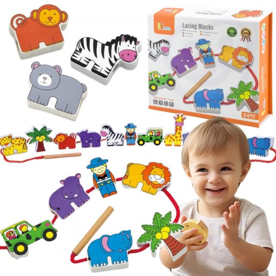 Piękne, kolorowe klocki do nawlekania zachęcają do zabawy. Każdy z 12 elementów został pomalowany dokładnie z obydwu stron. W zestawie znajduje się sznureczek z drewnianym kołeczkiem, który służy do nawlekania klocków w dowolnej kolejności. Klocki przedstawiają mieszkańców ZOO/Safari, samochód Jeepa, palmę oraz pana przewodnika - wszystko, aby jak najlepiej poznać mieszkańców Safari
