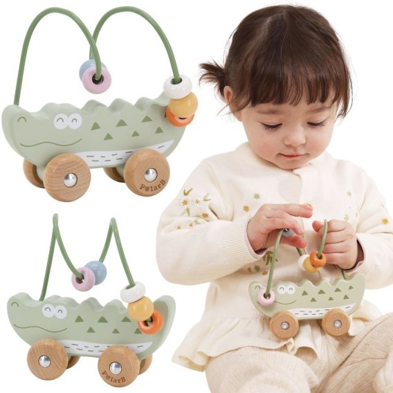 Uroczy labirynt koralikowy w kształcie Krokodyla to idealna pierwsza zabawka edukacyjna dla malucha już od 12. miesiąca życia. Łączy w sobie funkcję labiryntu z koralikami oraz jeździka do pchania, zapewniając podwójną radość z zabawy. Dziecko może przesuwać kolorowe koraliki po pałąku lub toczyć zabawkę po podłodze, rozwijając swoje umiejętności ruchowe. Naturalne drewno bukowe i zaokrąglone krawędzie gwarantują bezpieczeństwo podczas zabawy. To doskonały wybór dla rodziców szukających trwałej, estetycznej i edukacyjnej zabawki.