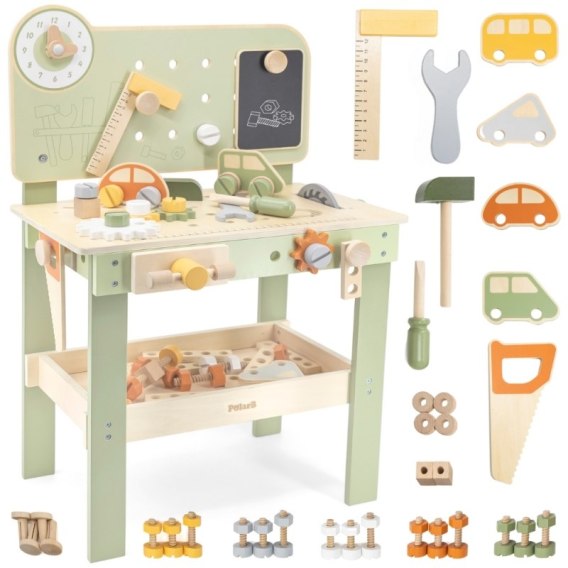 Warsztat majsterkowicza od marki Viga Toys z ekskluzywnej serii PolarB pozwoli poczuć się Twojemu dziecku jak prawdziwy mechanik. Dziecko może wbijać gwoździe, dokręcać śruby kluczem, a także przykręcać drewniane deski i zębatki do stołu warsztatowego. Zabawka posiada zegar ze wskazówkami, drewniane samochodziki oraz różne narzędzia.