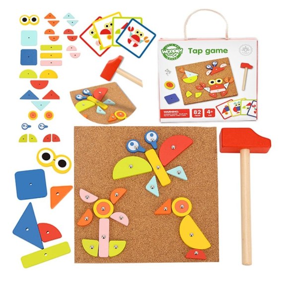 • - zestaw zawiera 82 el.: 30 klocków, 40 pinezki, 10 kart z 20 wzorami, tablice korkową oraz młotek