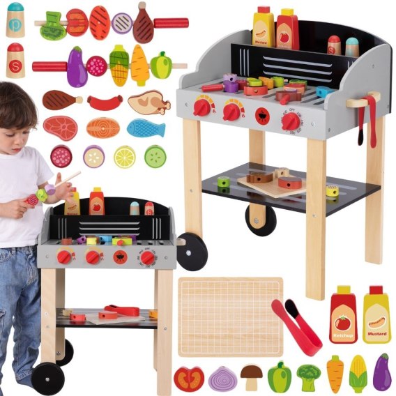 Drewniany Grill Ogrodowy od marki Woopie to wspaniała propozycja dla małych kucharzy, którzy uwielbiają naśladować dorosłych. Ten mobilny zestaw na kółkach pozwala na zabawę w grillowanie zarówno w domu, jak i w ogrodzie. Wykonany z wysokiej jakości drewna, pomalowany bezpiecznymi dla dzieci farbami, zachwyca żywą kolorystyką i dbałością o detale. Grill posiada otwieraną pokrywę, wygodną półkę na akcesoria oraz pokrętła, które imitują działanie prawdziwego urządzenia. W zestawie znajdują się liczne akcesoria kuchenne, takie jak szaszłyki, produkty spożywcze, sosy i szczypce, co gwarantuje wielogodzinną, kreatywną zabawę. To idealna zabawka do nauki przyrządzania posiłków i rozwijania pasji kulinarnych.