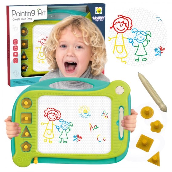 Znikopis Tablica Magnetyczna daje możliwość kreatywnej zabawy na długi czas! Tablica zachęca do pisania i rysowania. Rysowanie pozwoli skoncentrować, wyciszyć i uspokoić Twoje dziecko. Znikopis pozwala na tworzenie nieskończonejilośćobrazków - wystarczy przejechać specjalnym suwakiem, a rysunek zniknie i można rysować od nowa! Zestaw dodatkowo zawiera wygodny magiczny długopis oraz 4stempelki, które urozmaicą dzieło. Tablica posiada wygodny uchwyt, dzięki czemu dziecko może zabrać ją wszędzie. Znikopis rozwinie u dziecka zdolności manualne, wyobraźnie, kreatywność oraz da szansę na rozwinięcieartystycznejstrony dziecka!