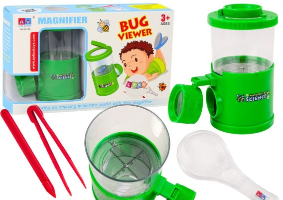 Wysokiej jakości lupa, która umożliwia dokładne oglądanie detali owadów i innych małych stworzeń. Praktyczny pojemnik wyposażony w szkło powiększające wbudowane w przykrywkę, co pozwala na wygodne obserwacje bez konieczności wyciągania owadów z pojemnika. Specjalny patyczek z chwytakiem, który umożliwia delikatne łapanie i przenoszenie owadów do pojemnika, bez ryzyka ich uszkodzenia.  Pojemnik posiada ruchome drzwi, które zapewniają łatwy dostęp do jego wnętrza i pozwalają na szybkie wypuszczenie złapanych owadów z powrotem na wolność. Zestaw jest idealny do obserwacji ulubionych małych stworzeń.