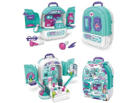 Plecak otwierany jest z dwóch stron. Każda z nich kryje w sobie mnóstwo możliwości zabawy. Jedna to zestaw do leczenia zabawek z specjalistycznymi sprzętami i akcesoriami jak np. termometr czy stetoskop. Druga strona to uroczy domek dla lalek, który może posłużyć za przychodnię lekarską z poczekalnią, łazienką i miłą pielęgniarką.